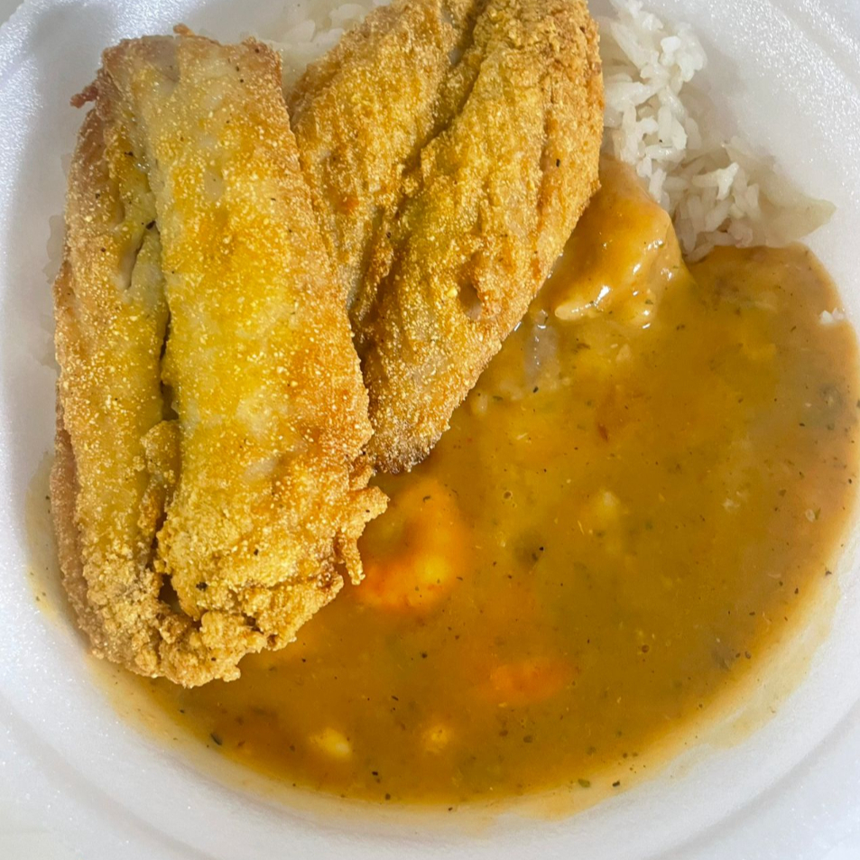 Acompanha filé de pescadinha arroz pirão