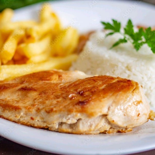 File de Frango Grelhado acompanhado de Fritas, Arroz Branco, Feijão, Farofa e Salada de Alface Especial.