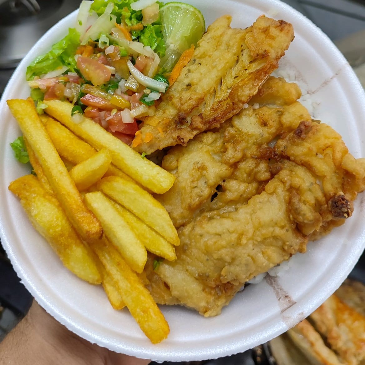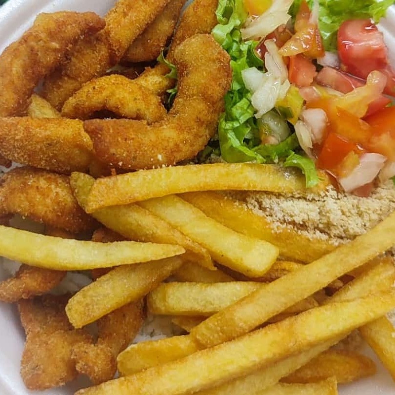 Delicioso Filé de Peixe sem Espinhas com muita Carne com Batata Frita, Salada de Alface com Tomate e Cebola, Arroz Branco, Feijão e Farofinha.