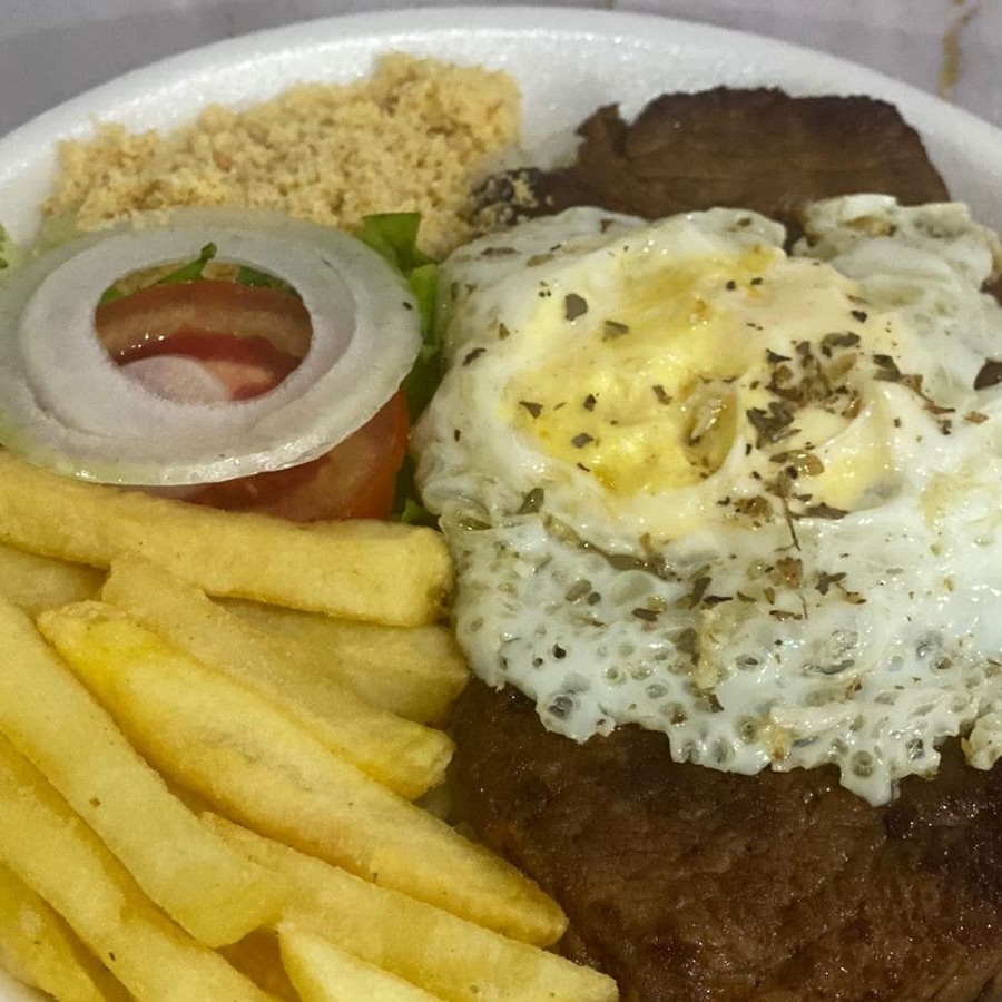 Pão, 2 bife contra-file, 2 ovos, 2 queijos, salada e molho