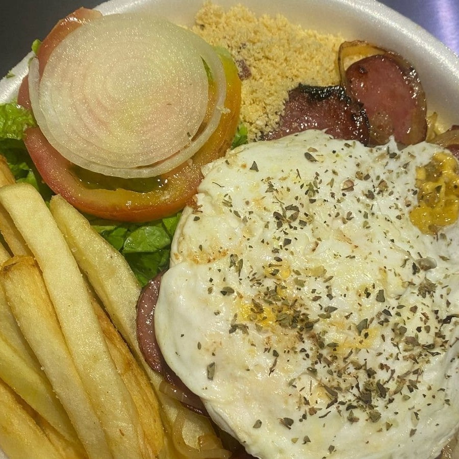 Pão, carnes de picanha, ovos, cheddar, bacon, calabresa, salada e molho.