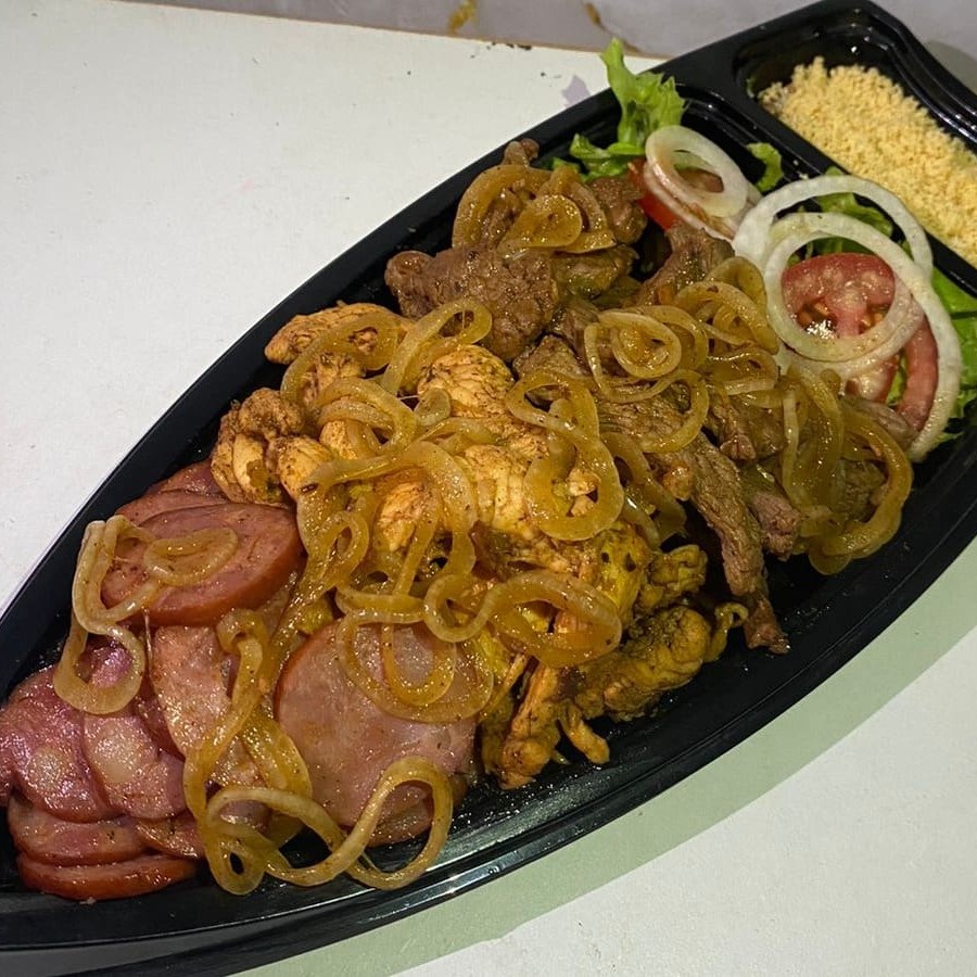 Farofa, Salada, Isca De Carne, Isca De Frango E Linguiça Acebolado.