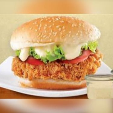 Pão de hamburguer com gergelim, 130g filé de frango empanado crocante e suculento, tomate, cebola ao shoyu, alface crespa e maionese da casa.