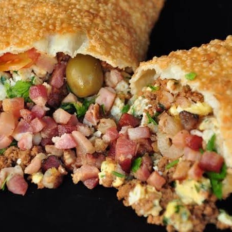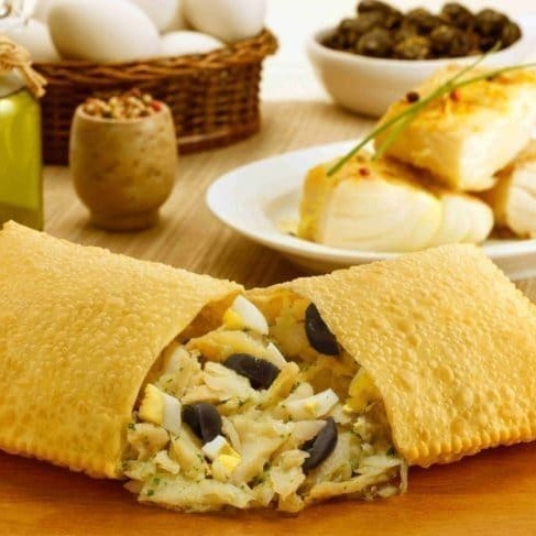 Pastel de tamanho 13x23 cm recheado com bacalhau temperado com cebola, pimentão, alho, azeite, cream cheese, tomate e milho.