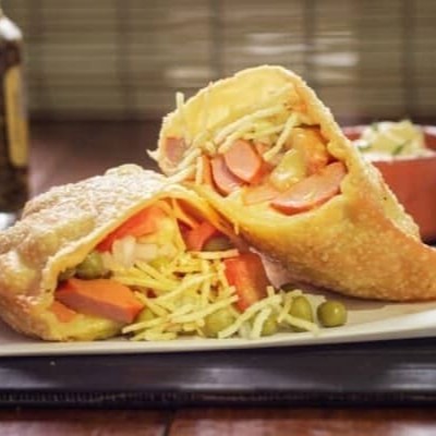 Pastel de tamanho 13x23 cm recheado com mussarela, salsicha, bacon, tomate, cebola, milho, queijo ralado e batata palha.