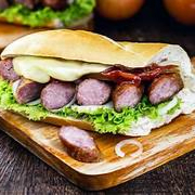 pão baguete de 15cm linguiça toscana grelhada, cebola ao shoyu, cream cheese e maionese defumada da casa.