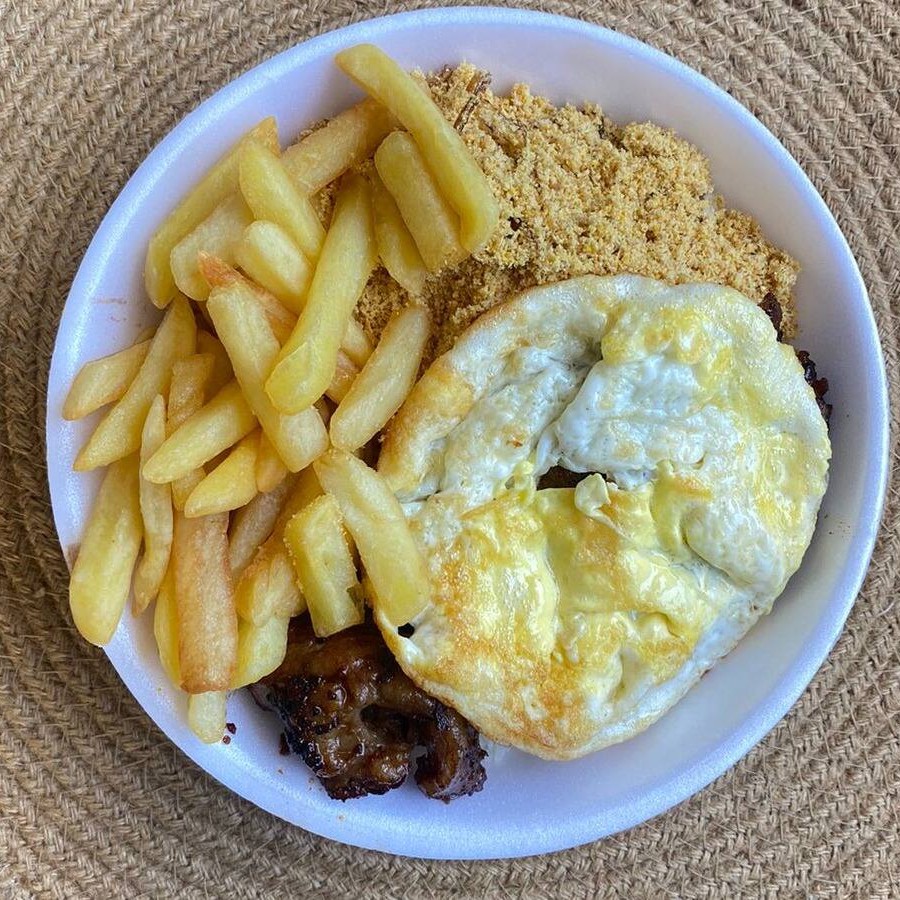 Contra-filé grelhado suculento acompanhado de dois ovos fritos, arroz branco soltinho, feijão caseiro, macarrão e farofa. Escolha gratuitamente batata frita crocante ou salada de legumes frescos como acompanhamento. Também disponível purê de batata cremoso por apenas +R$2,00.