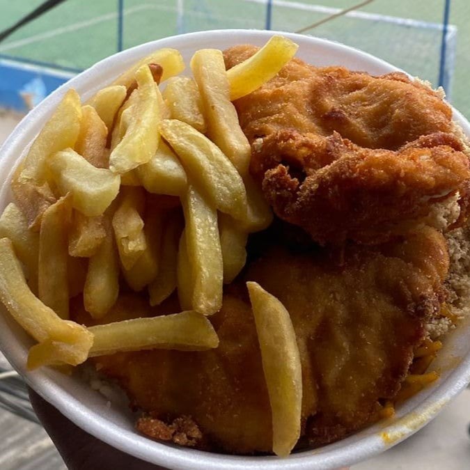Filé de frango à milanesa crocante acompanhado de arroz branco soltinho, feijão caseiro, macarrão e farofa. Escolha gratuitamente batata frita crocante ou salada de legumes frescos como acompanhamento. Também disponível purê de batata cremoso por apenas +R$2,00. Marmita bem servida preparada na hora.