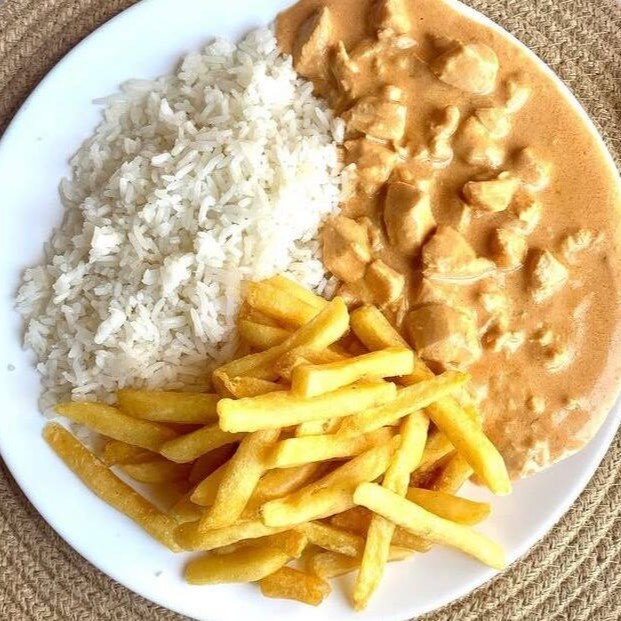 Strogonoff de frango cremoso acompanhado de arroz branco soltinho e batata frita crocante. Marmita bem servida preparada na hora. (esse prato não tem feijão, macarrão e farofa — está correto assim)