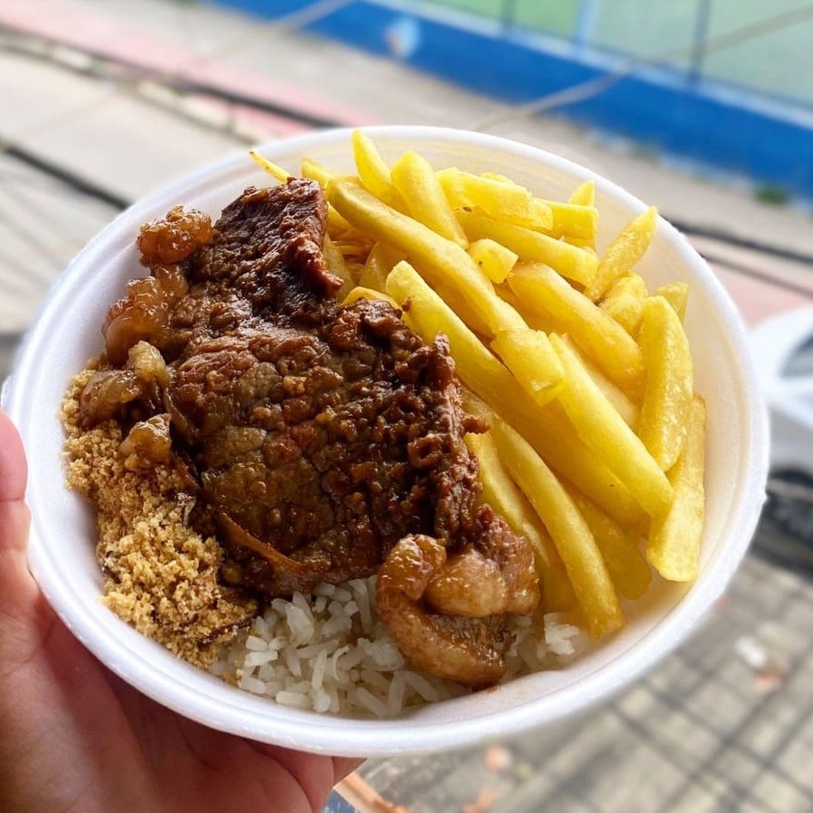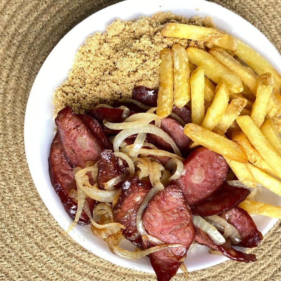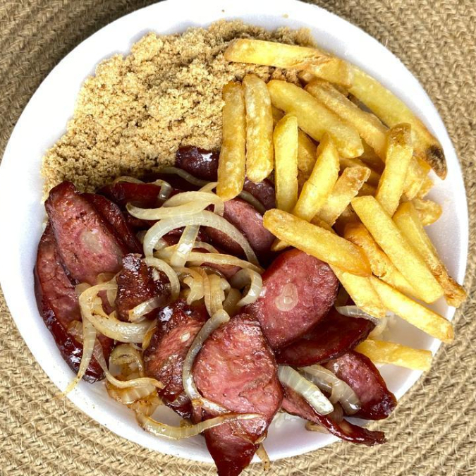 Linguiça acebolada bem temperada acompanhada de arroz branco soltinho, feijão caseiro, macarrão e farofa. Escolha gratuitamente batata frita crocante ou salada de legumes frescos como acompanhamento. Também disponível purê de batata cremoso por apenas +R$2,00. Marmita bem servida preparada na hora.