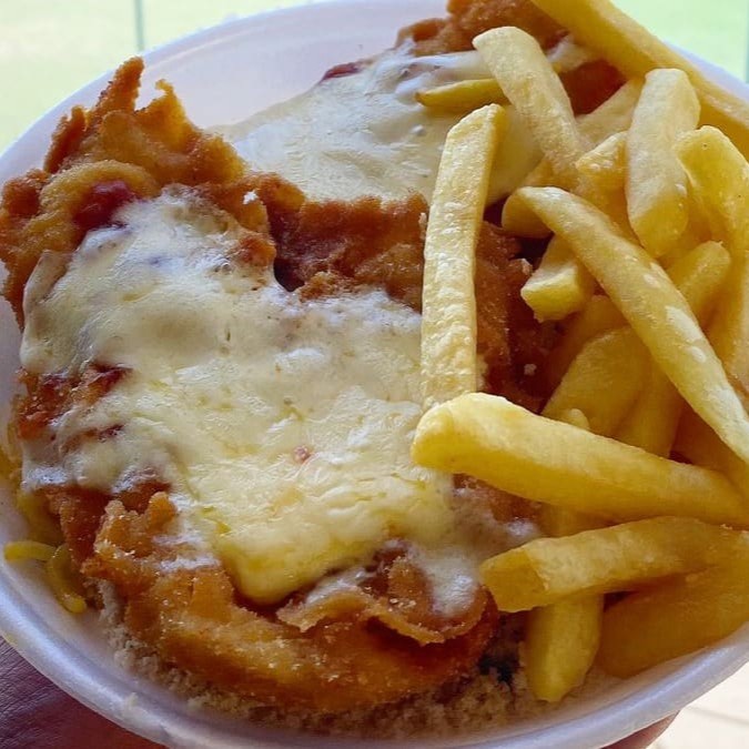 Filé de frango à milanesa coberto com molho de tomate e queijo derretido acompanhado de arroz branco soltinho, feijão caseiro, macarrão e farofa. Escolha gratuitamente batata frita crocante ou salada de legumes frescos como acompanhamento. Também disponível purê de batata cremoso por apenas +R$2,00.