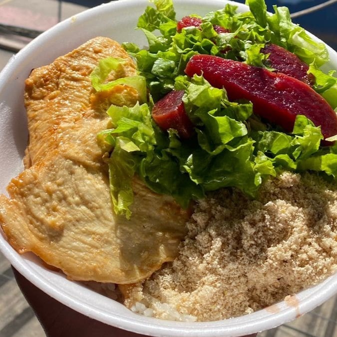 Filé de frango grelhado suculento acompanhado de arroz branco soltinho, feijão caseiro, macarrão e farofa. Escolha gratuitamente batata frita crocante ou salada de legumes frescos como acompanhamento. Também disponível purê de batata cremoso por apenas +R$2,00. Marmita bem servida preparada na hora.