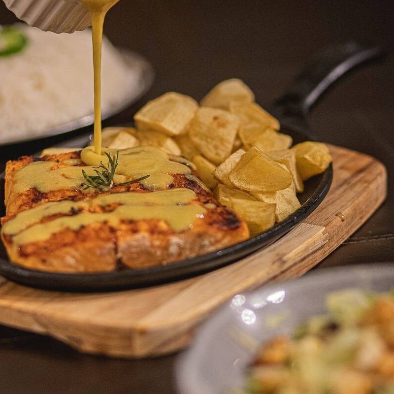 Posta de aproximadamente 300g de salmão grelhado na brasa. Acompanha arroz branco tio joão, batata souté, salada caesar e molho cítrico.