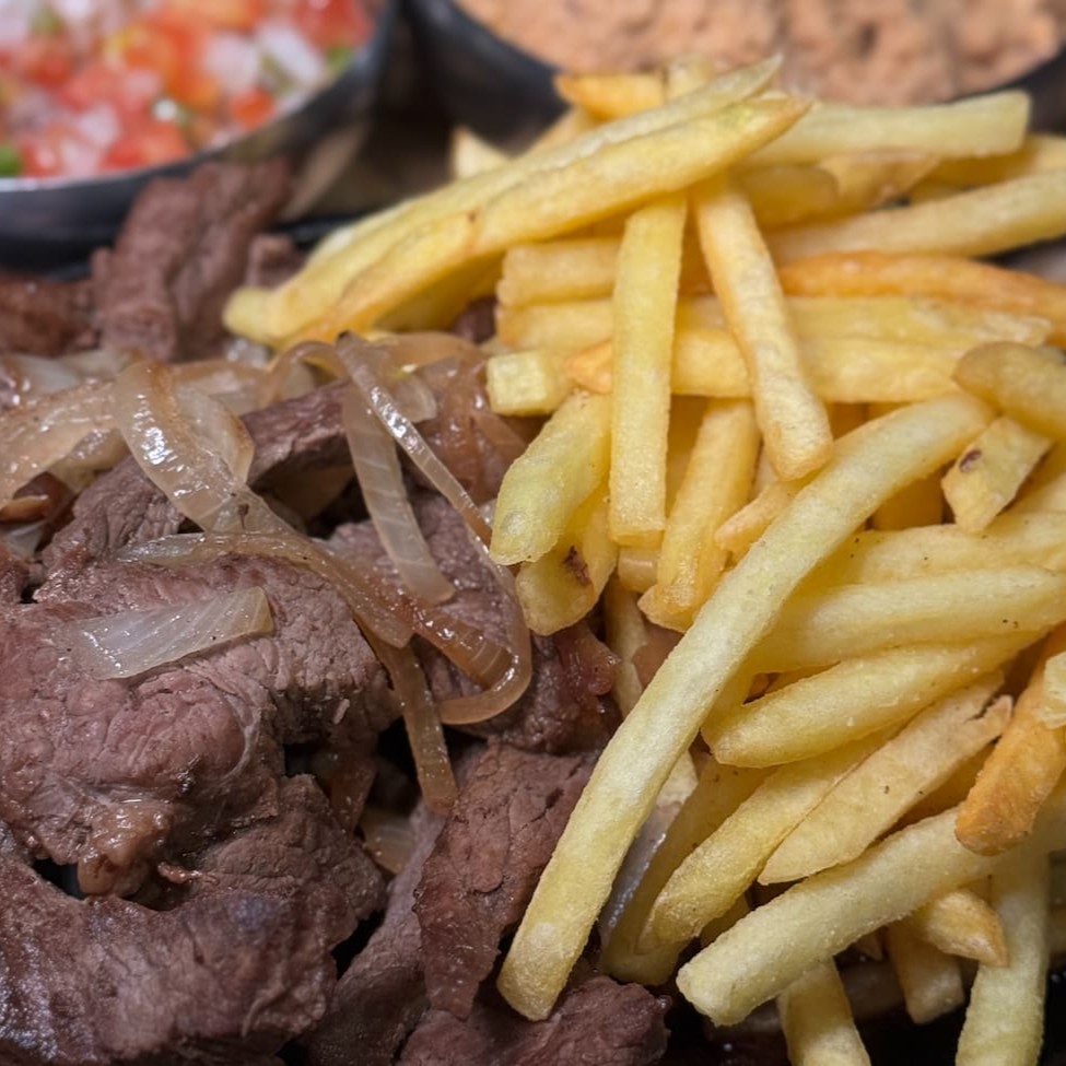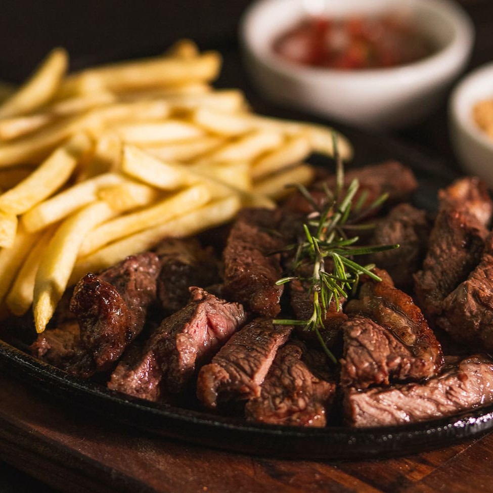 Aproximadamente 400g de churrasquinho de alcatra servido com batatas fritas
