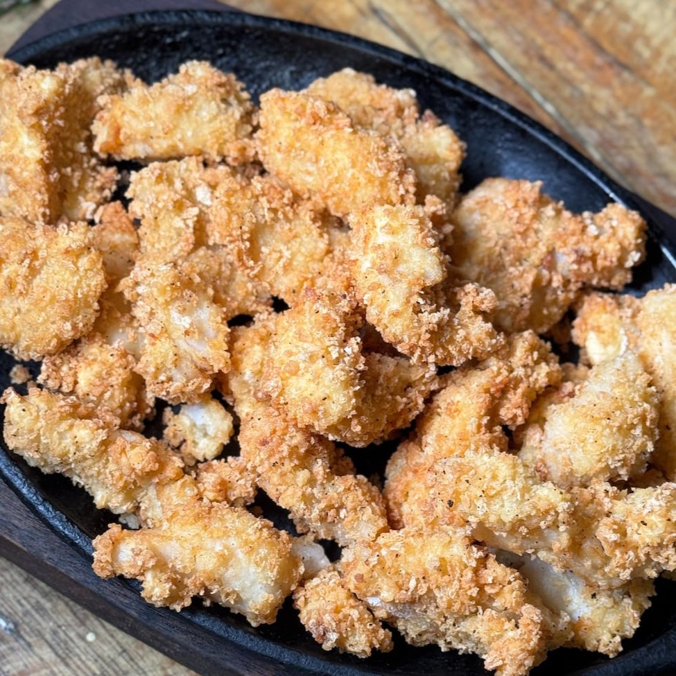 Frango crocante em tiras empanados na farinha panko e servido com molho rosé