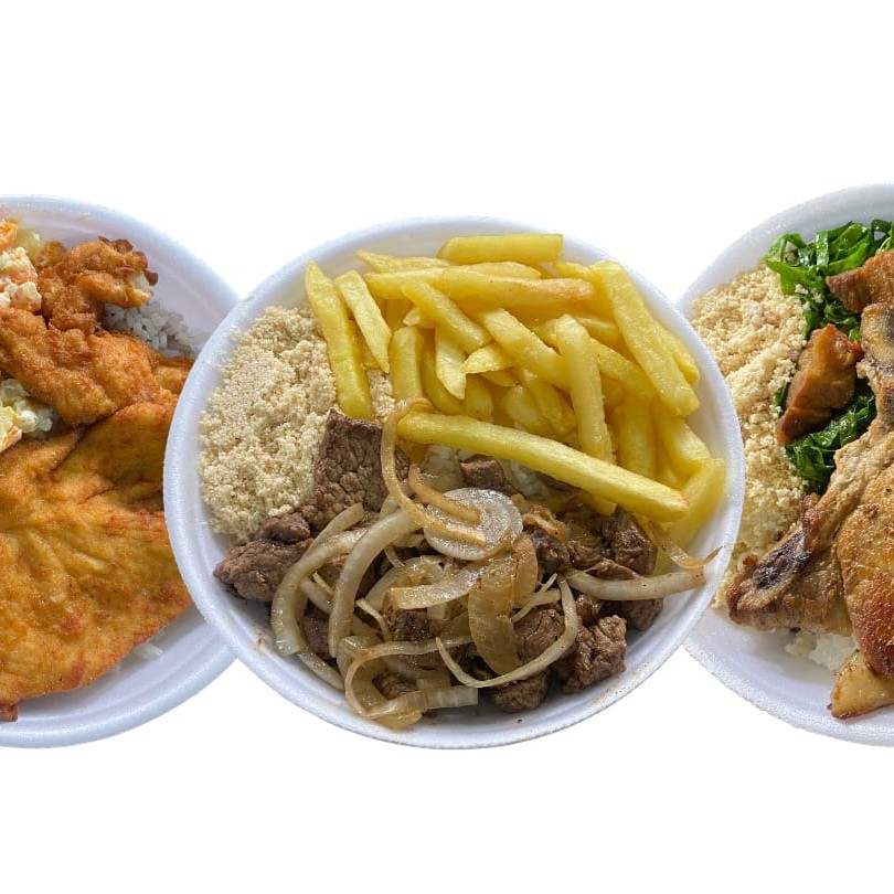 Acompanha arroz branco Tio João, feijão preto + farofa opcional + 01 opção de acompanhamento + 01 opção de proteína. Serve 01 pessoa. Obs. Não separamos itens da refeição.