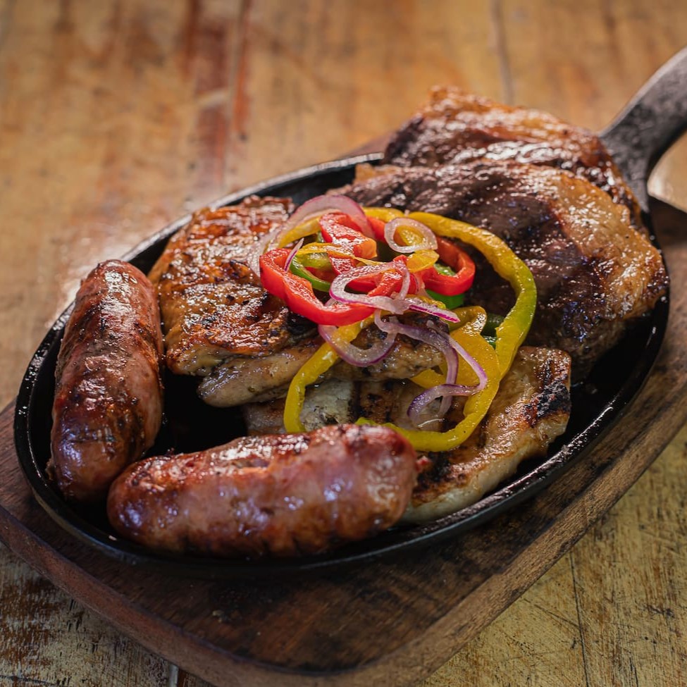 Aproximadamente 600g de proteína. 300g de picanha, um lombo suíno, uma sobrecoxa de frango e duas linguiças toscanas. Acompanha arroz branco Tio João, batatas fritas, molho a camanha e farofa.