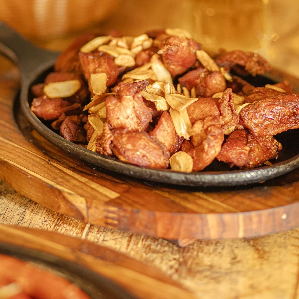 Aproximadamente 400g de picanha nobre argentina, fatiada e feita na brasa. Acompanhada de batatas fritas, farofa torrada e vinagrete.