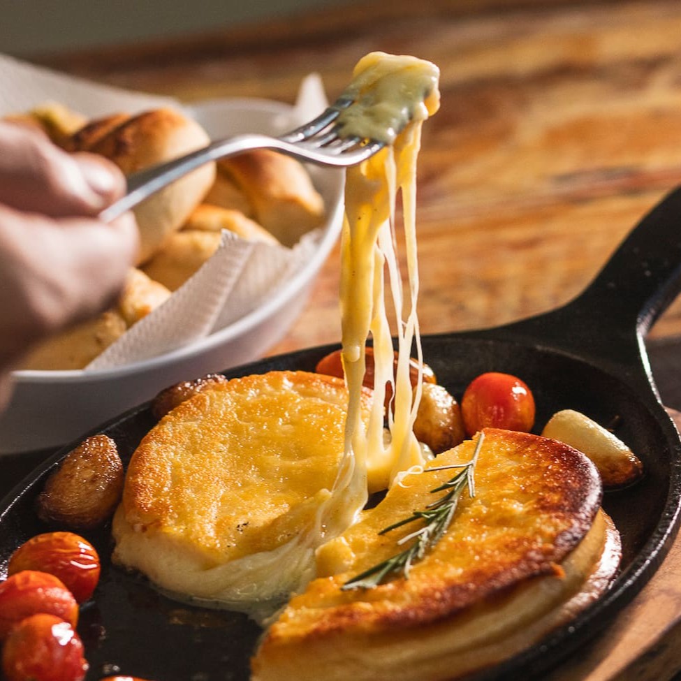 Fatia alta de 200g de queijo provolone selecionado, com tomate confitado e acompanhado de torradas