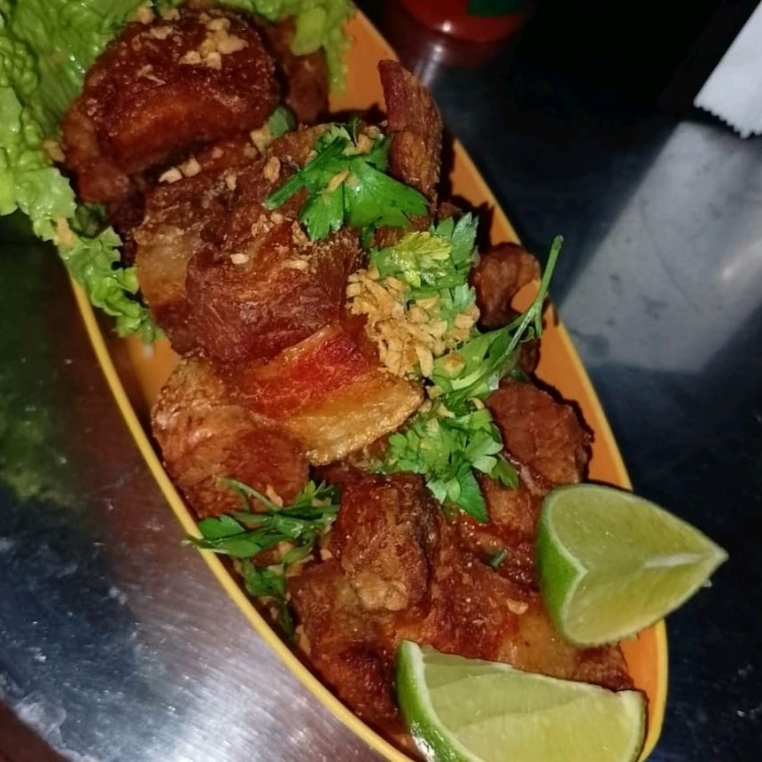 Barriga suína500gr, azeitona, cheiro verde, alho frito e limão.