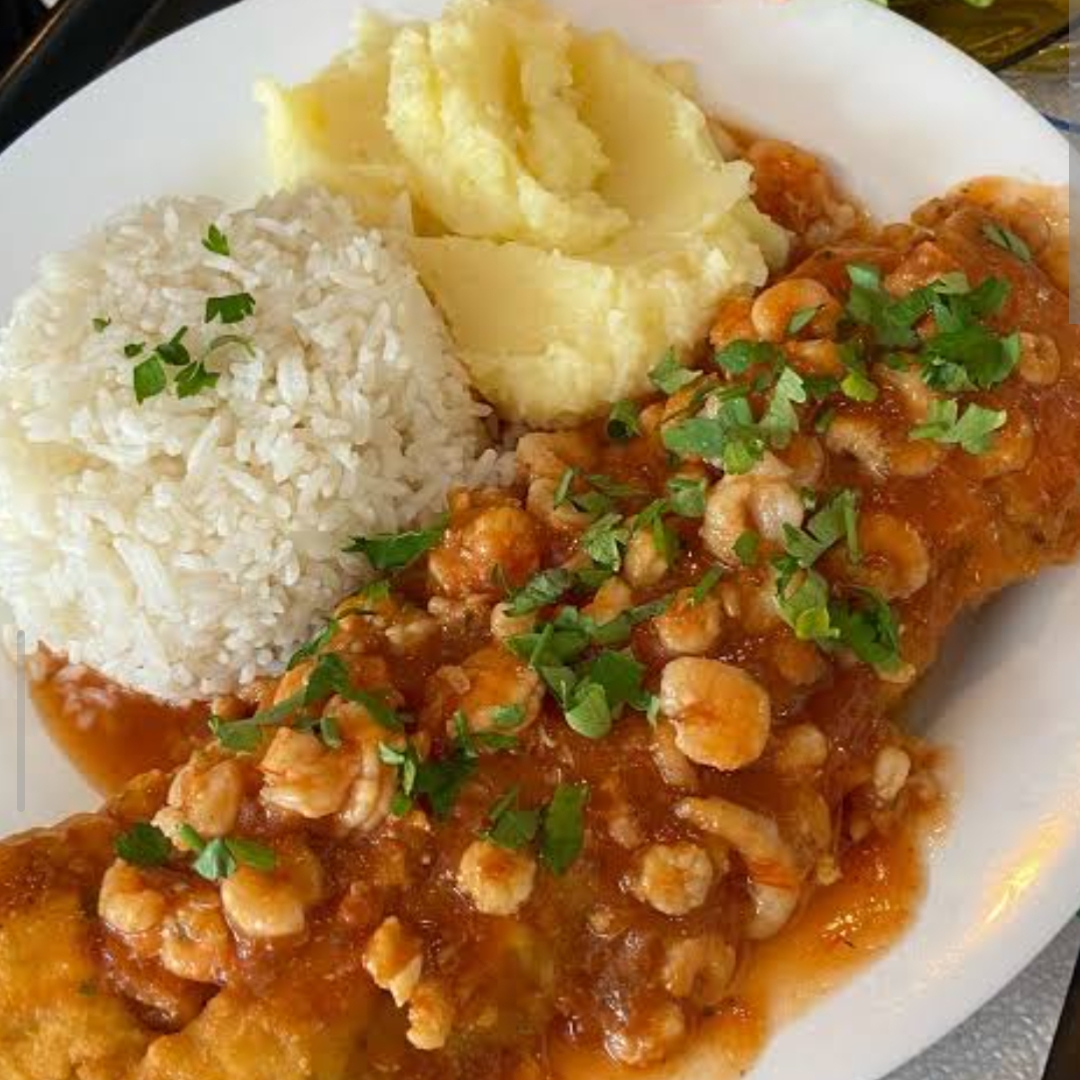 Deliciosa refeição de filé ao molho de camarão acompanhada de arroz fresquinho, salada verde especial, purê de batata ou fritas