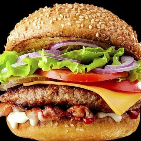 Hamburguer de picanha, alface, tomate, queijo muçarela, pão brioche, tiras de bacon, ovo, cebola roxa. acompanha batata frita.
