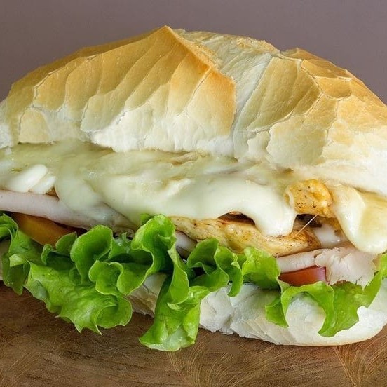 Filé de frango, pão francês, salada de tomate, alface, cebola, queijo muçarela, peito de peru, acompanha batata frita.