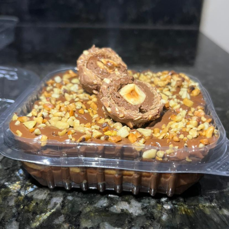Massa de chocolate, recheada com Nutella, brigadeiro cremoso de chocolate, finalizada com castanha, Nutella e bombom Ferrero.
