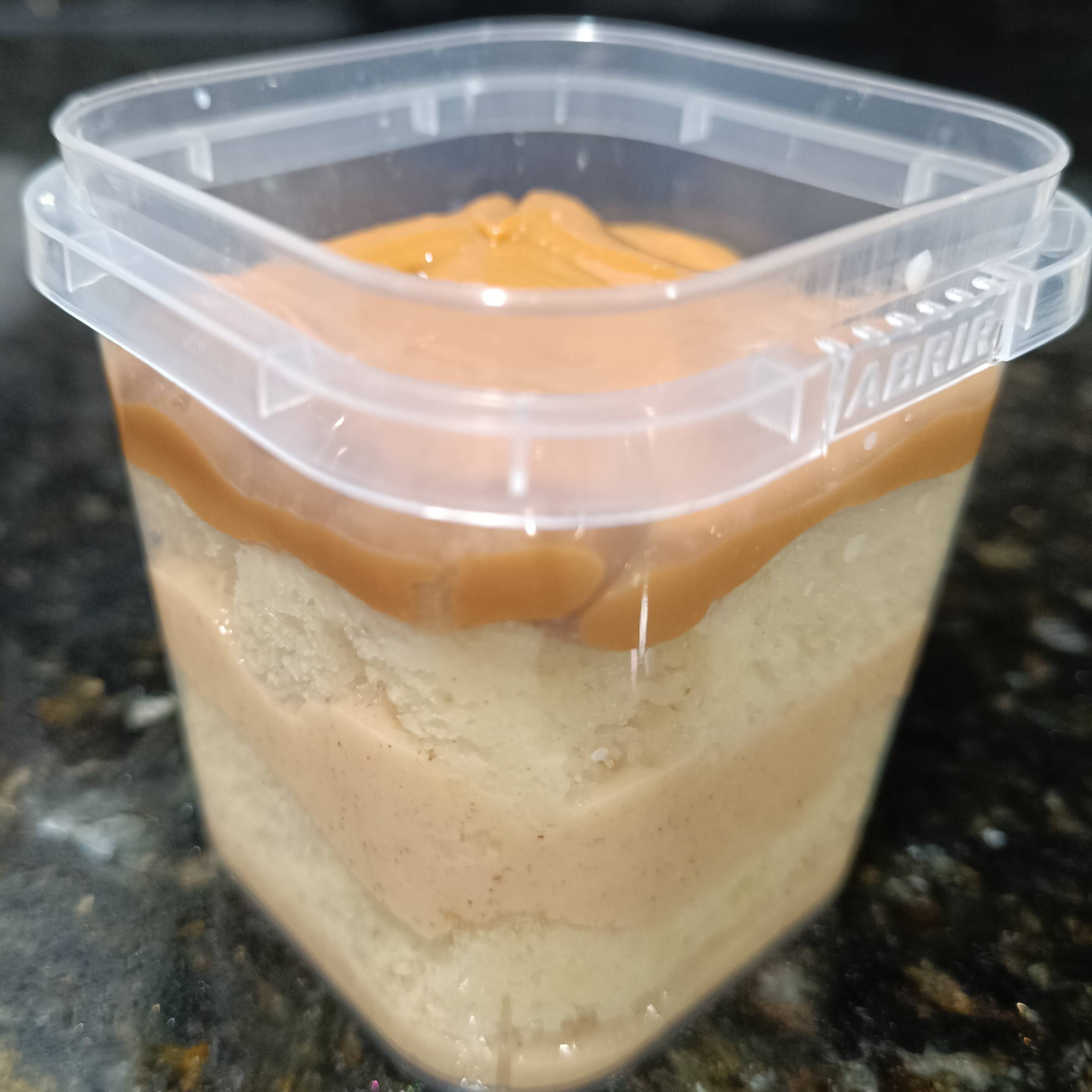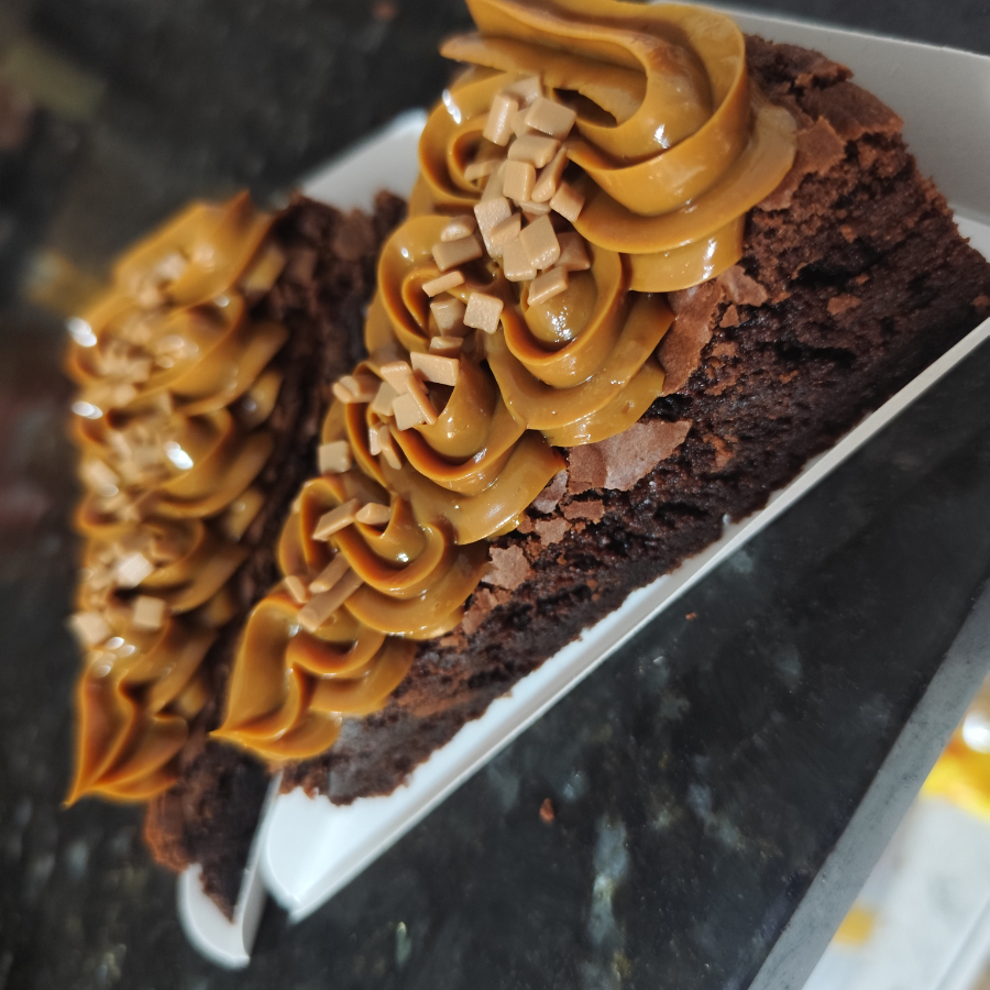 Fatia do nosso brownie com uma massa bem chocolatuda e uma leve casquinha crocante por fora. Generosa cobertura de doce de leite cozido na panela de pressão e finalizado com granulado de caramelo nobre.