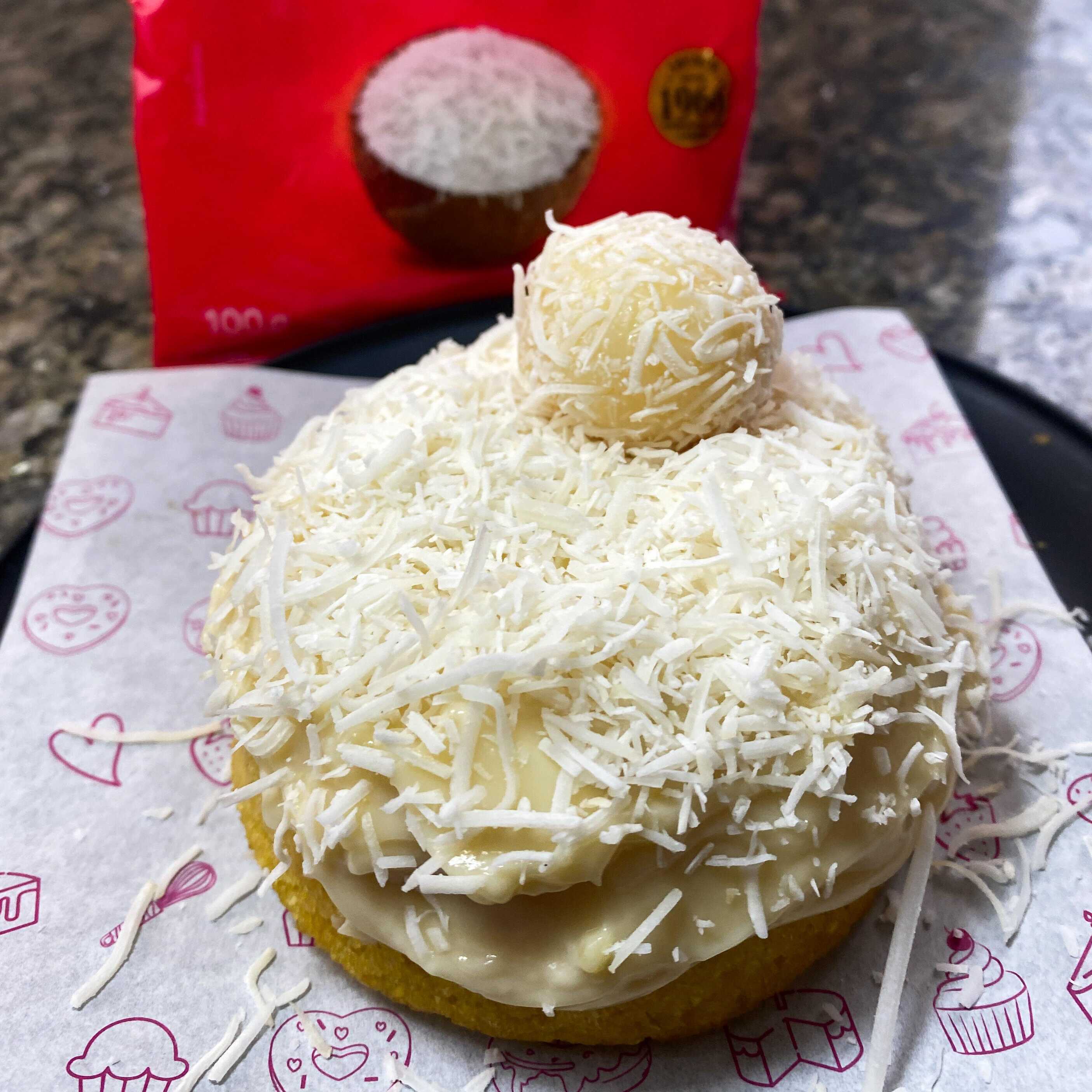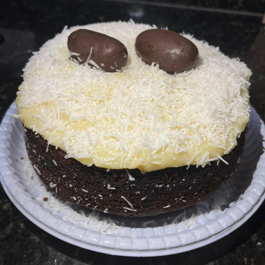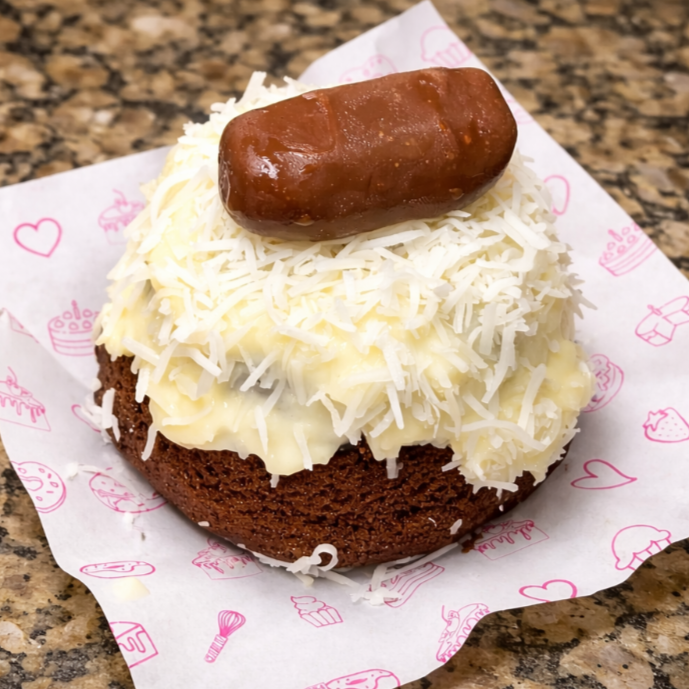 Massa de chocolate, recheada com creme de coco cremoso, finalizado com granulado de chocolate e um bombom de coco.