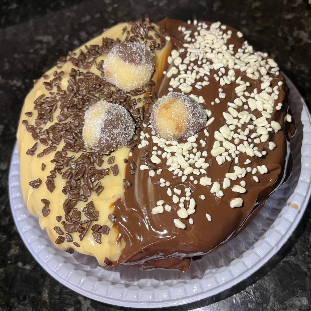 Massa branca, recheada com brigadeiro cremoso de chocolate preto e branco, finalizada com granulado mesclado.