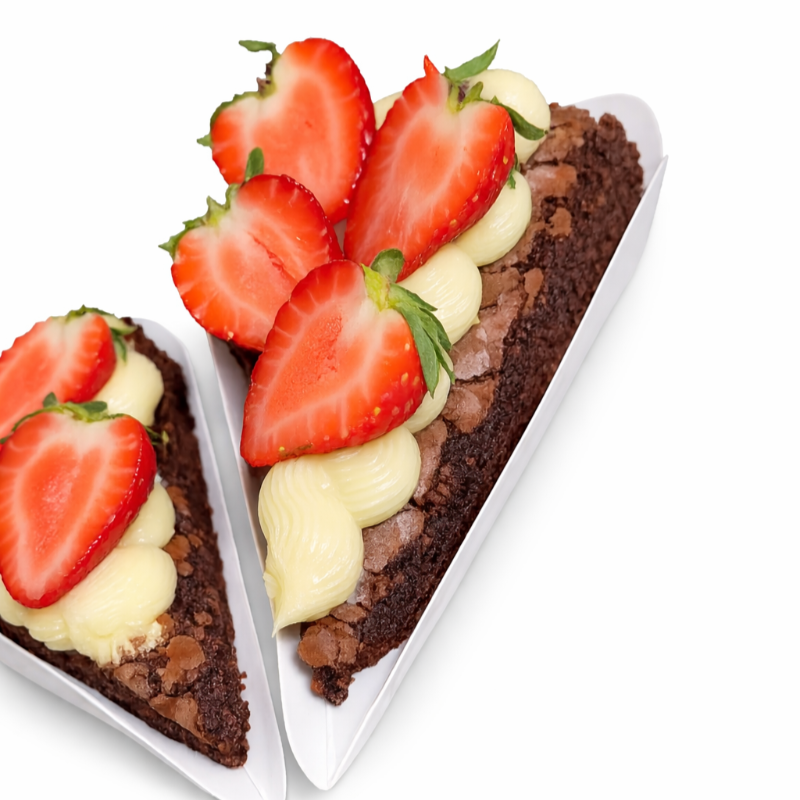 Fatia do nosso brownie com uma massa bem chocolatuda e uma leve casquinha crocante por fora. Generosa cobertura do nosso doce cremoso de leite Ninho e finalizado com morangos frescos e selecionados.