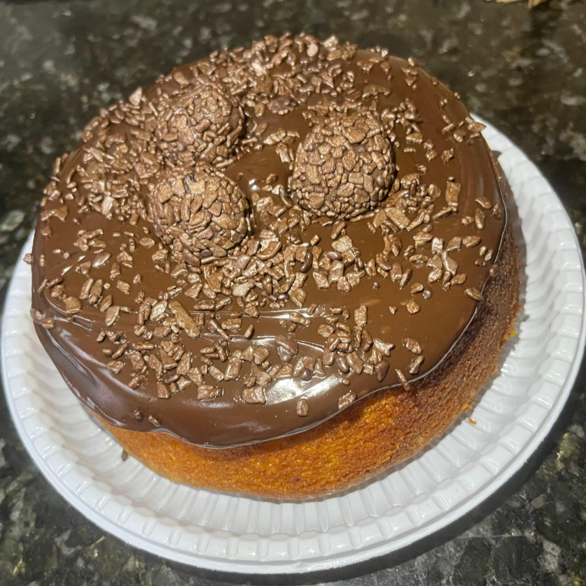 Massa de cenoura, recheado com brigadeiro de chocolate cremoso, finalizado com granulado preto e brigadeiro.