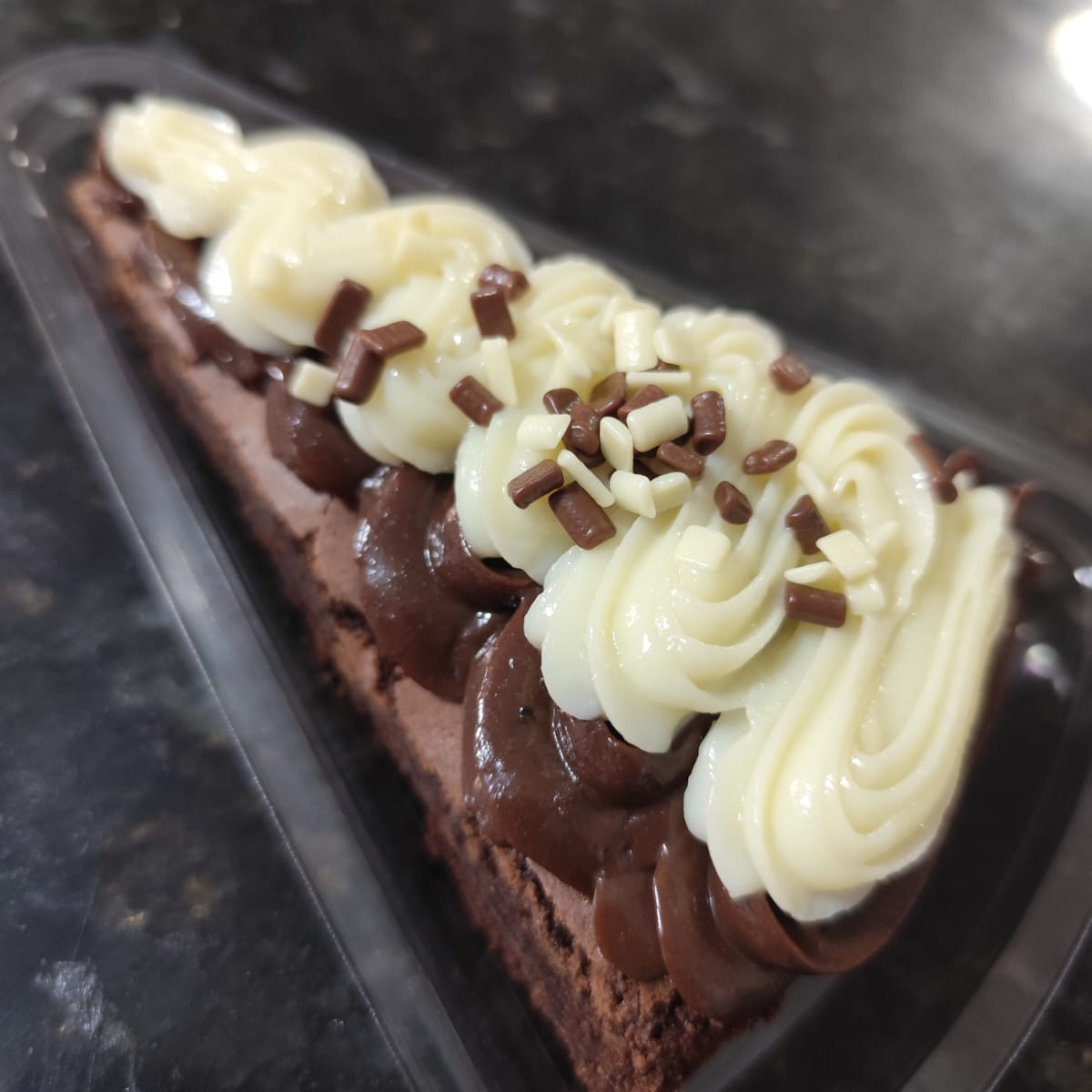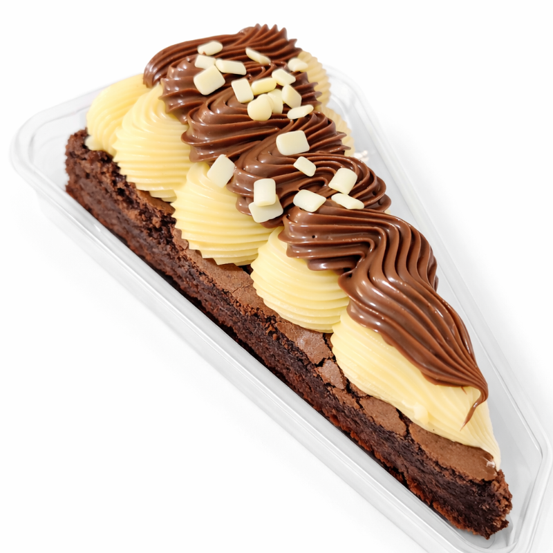 Fatia do nosso brownie com uma massa bem chocolatuda e uma leve casquinha crocante por fora. Generosa cobertura de brigadeiro cremoso de chocolate branco e preto, e finalizado com granulado nobre.