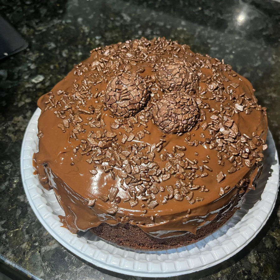 Massa de cenoura, recheada com brigadeiro de chocolate cremoso, finalizada com granulado preto e brigadeiro.