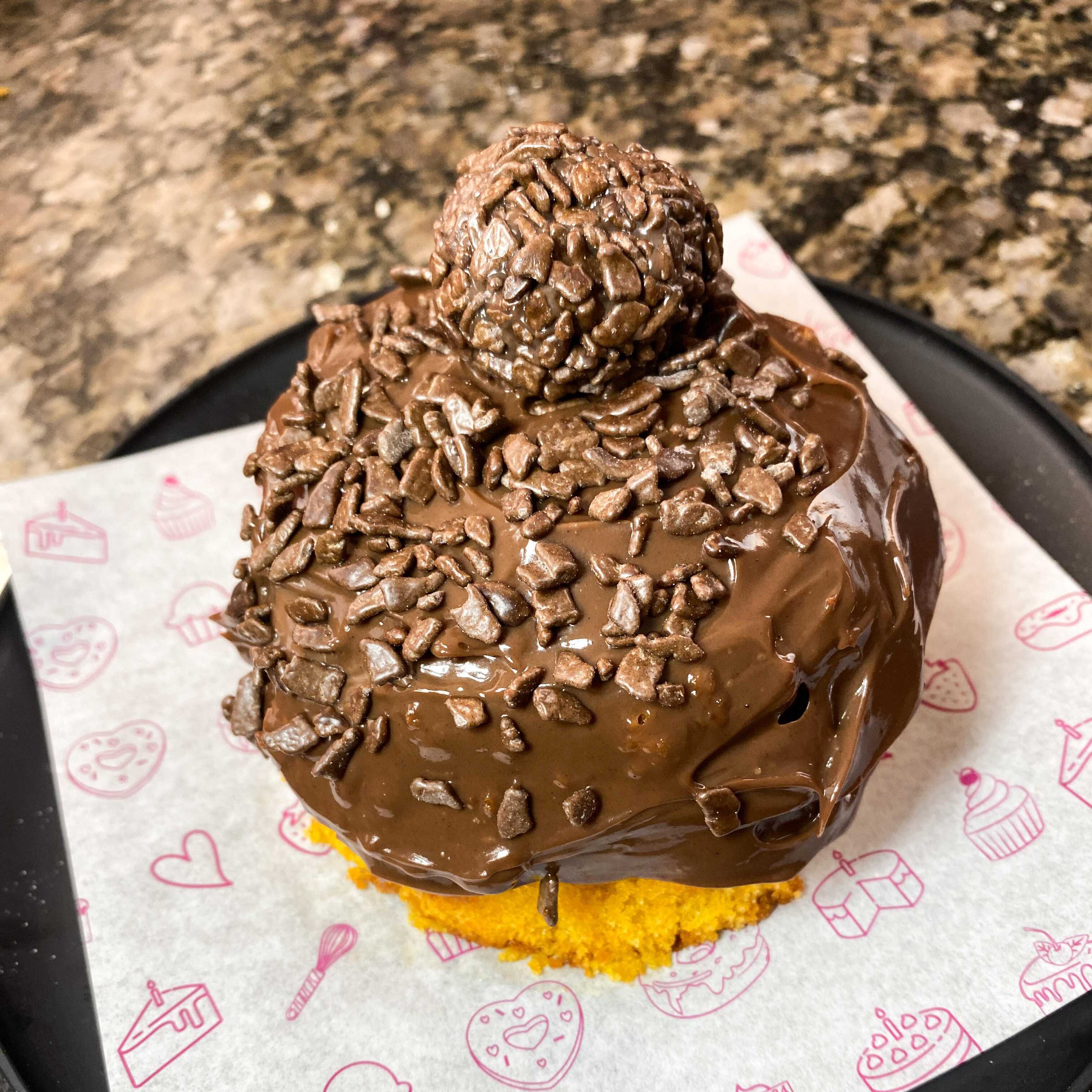 Massa de chocolate, recheada com brigadeiro de chocolate cremoso, finalizado com granulado e brigadeiro.