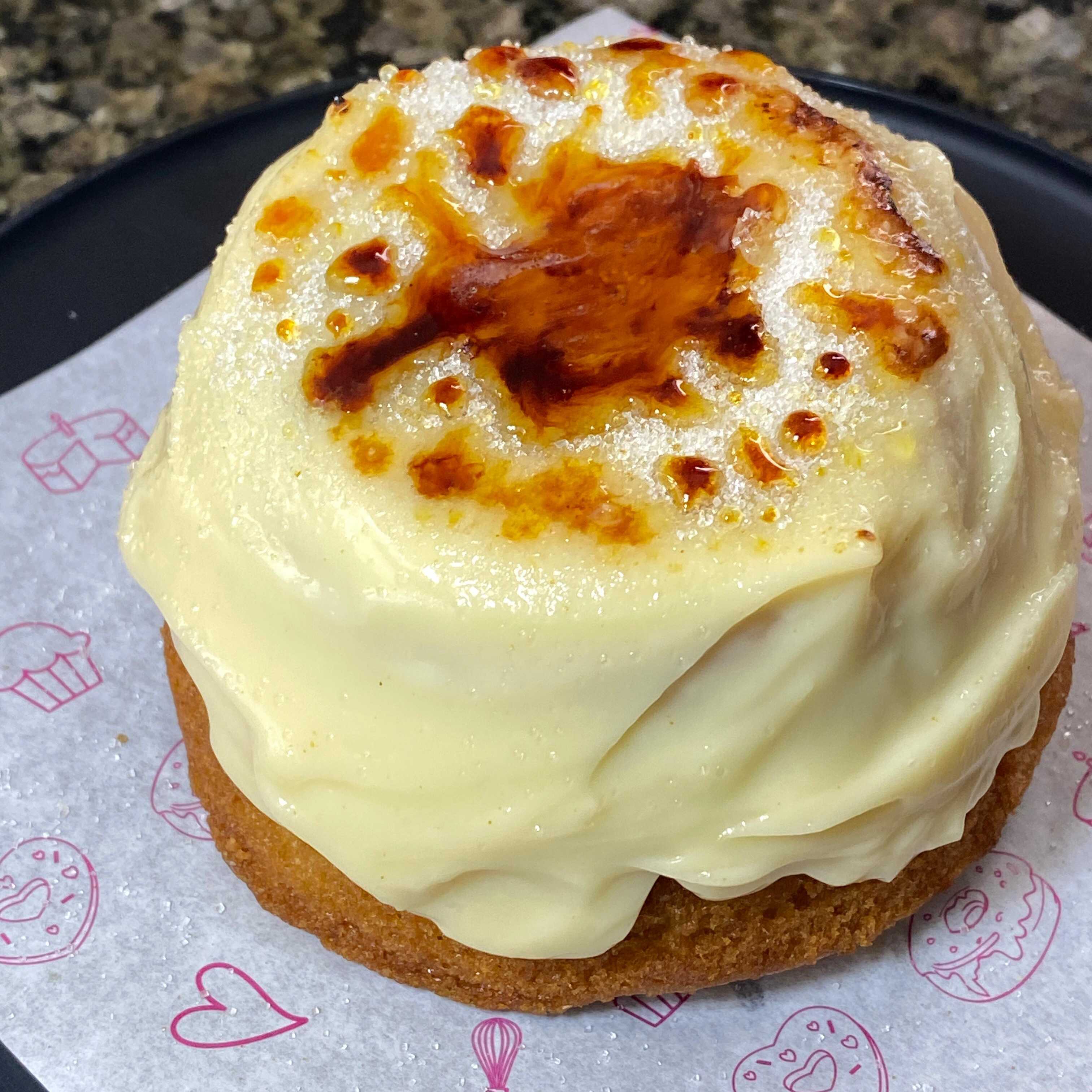 Massa branca, recheada com creme brûlée e morango, finalizada com açúcar caramelizado e morango.