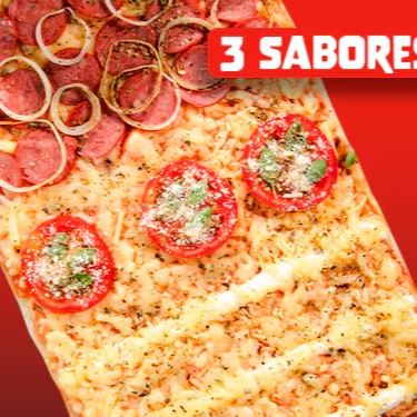 Pizza grande com três sabores irresistíveis: calabresa — molho de tomate da casa, queijo mussarela derretido, deliciosa calabresa Frimesa fatiada, cebola fresquinha e um toque de orégano; mussarela - Molho de tomate da casa, queijo mussarela derretido e um toque de orégano. ; e Marguerita - Molho de tomate da casa, queijo mussarela derretido, tomate e manjericão frescos, parmesão ralado e um toque de orégano.