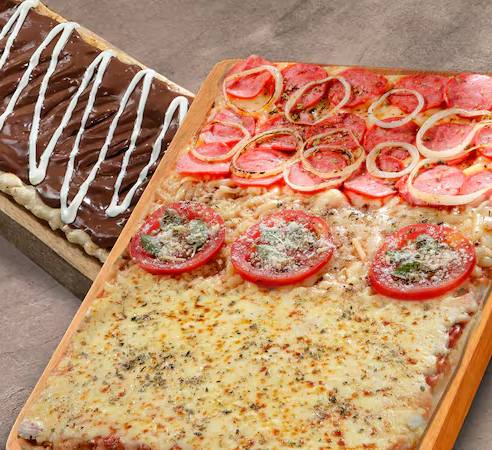 Pizza Grande (38cm X 25cm) com três sabores irresistíveis: calabresa fantástica — molho de tomate da casa, queijo mussarela derretido, deliciosa calabresa fatiada Frimesa, parmesão saboroso e um toque de orégano; três queijos — molho de tomate da casa, Catupiry, queijo mussarela derretido, parmesão saboroso e um toque de orégano; e portuguesa — molho de tomate da casa, queijo mussarela derretido, presunto, ovos cozidos no ponto certo, calabresa ralada Frimesa, pimentão fresco, finalizada com azeite e um toque de orégano. Acompanha uma pizza Média (25cm X 25cm) meio a meio: Banana Nevada — banana fatiada, chocolate branco forneado crocante, doce de leite cremoso Santa Maria e finalizada com canela; e Cheesecake — chocolate branco forneado crocante, cream cheese e calda de morango artesanal.
