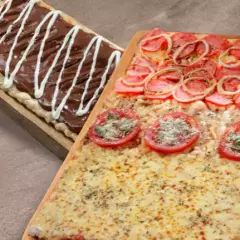 Duas pizzas grandes (38cm X 25cm) à sua escolha, acompanhadas de uma pizza Média doce (25cm X 25cm) e um refrigerante de 1,5L grátis.