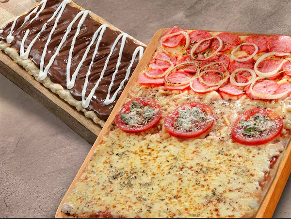 Pizza Grande (38cm X 25cm) com três sabores irresistíveis: calabresa fantástica — molho de tomate da casa, queijo mussarela derretido, deliciosa calabresa fatiada Frimesa, parmesão saboroso e um toque de orégano; três queijos — molho de tomate da casa, Catupiry, queijo mussarela derretido, parmesão saboroso e um toque de orégano; e portuguesa — molho de tomate da casa, queijo mussarela derretido, presunto, ovos cozidos no ponto certo, calabresa ralada Frimesa, pimentão fresco, finalizada com azeite e um toque de orégano. Acompanha uma pizza Média (25cm X 25cm) meio a meio: Banana Nevada — banana fatiada, chocolate branco forneado crocante, doce de leite cremoso Santa Maria e finalizada com canela; e Cheesecake — chocolate branco forneado crocante, cream cheese e calda de morango artesanal.