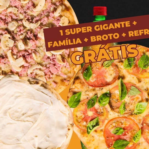 1 Pizza Super Gigante de 45cm + 1 Pizza Família de 35cm + 1 Brotão doce de 25cm + 1 Refrigerante de 2l ou 1,5l