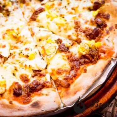 Molho de tomate, mussarela, ovos, bacon e orégano