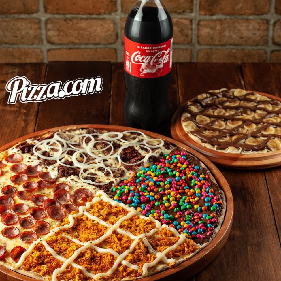 Nossa deliciosa Pizza acompanhada de um Refrigerante 2 lt Grátis ou Coca-Cola 1,5lt, Guaraná Antártica, Mineirinho, Sprite por + R$ 2. + uma pizza brotão doce por apenas + R$ 14.