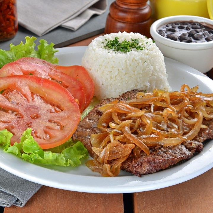 Arroz Branco, Feijão Preto, Farofa, Salada Verde e Molho à Campanha.