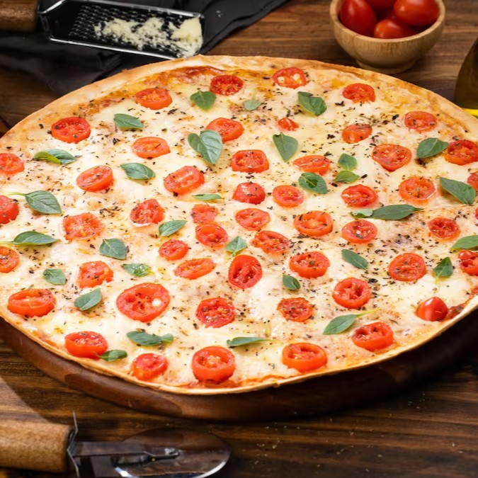 Compre com 1 clique!! Pizza Grande de 35cm. Nossa pizza de massa super fina, leve e borda crocante, com base de molho de tomate, mussarela, tomate cereja fatiado, finalizada com folhas de manjericão fresco e orégano.