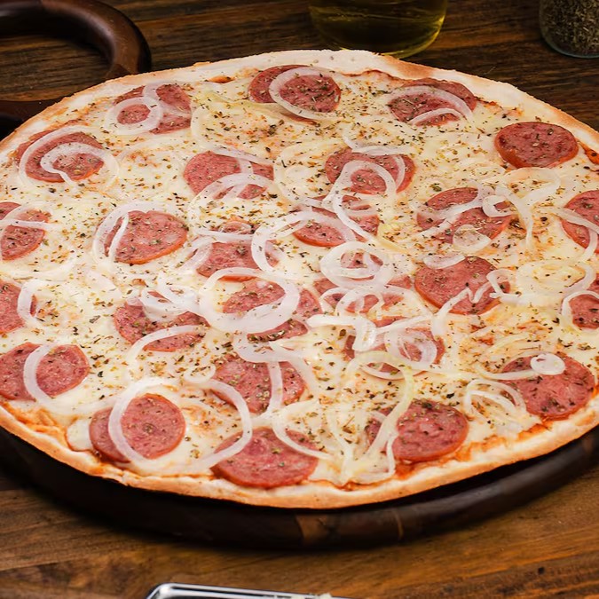 Compre com 1 clique!! Pizza Grande de 35cm. Nossa pizza de massa super fina, leve e borda crocante, com base de molho de tomate, mussarela, calabresa, cebola fatiada fininha, finalizada com orégano.