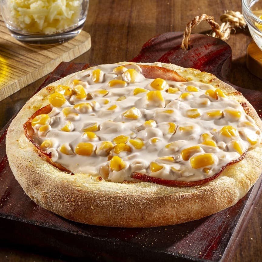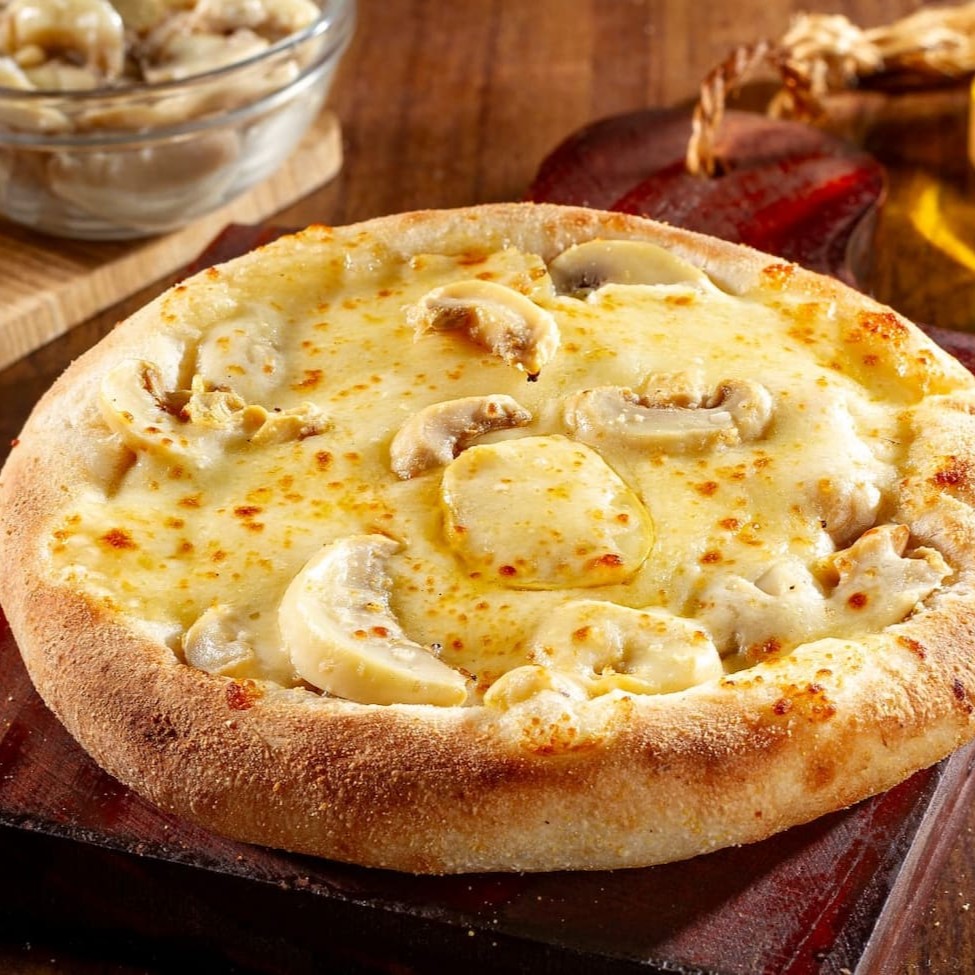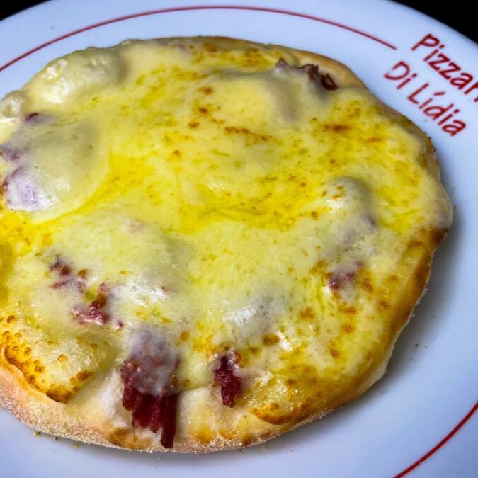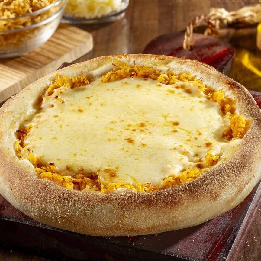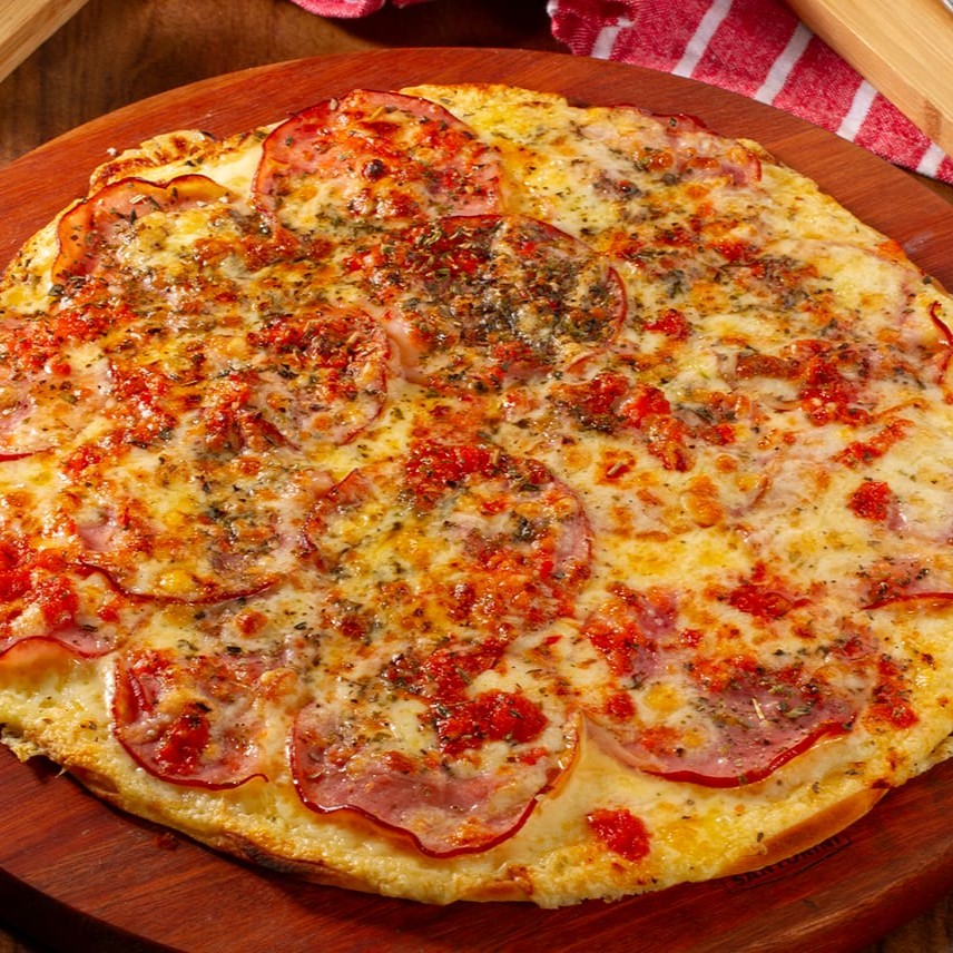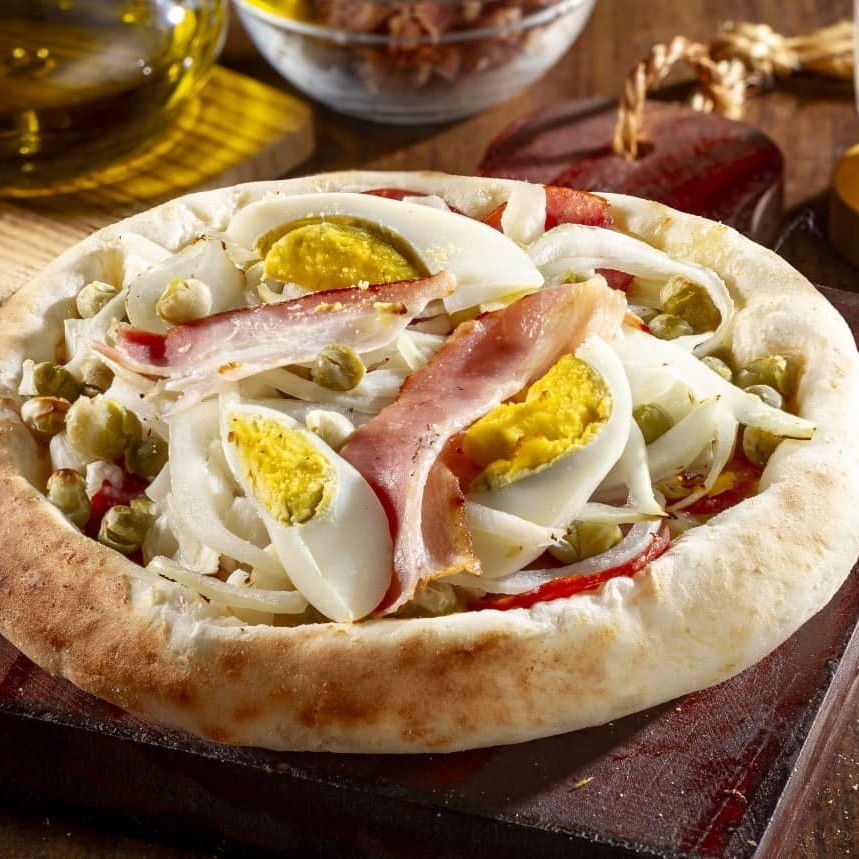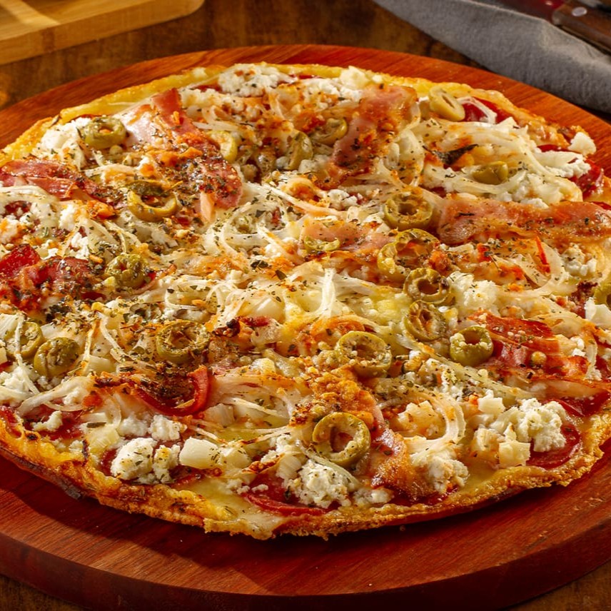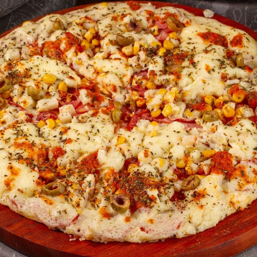 Muçarela, presunto, ervilha, palmito, calabresa, ovos e bacon.