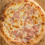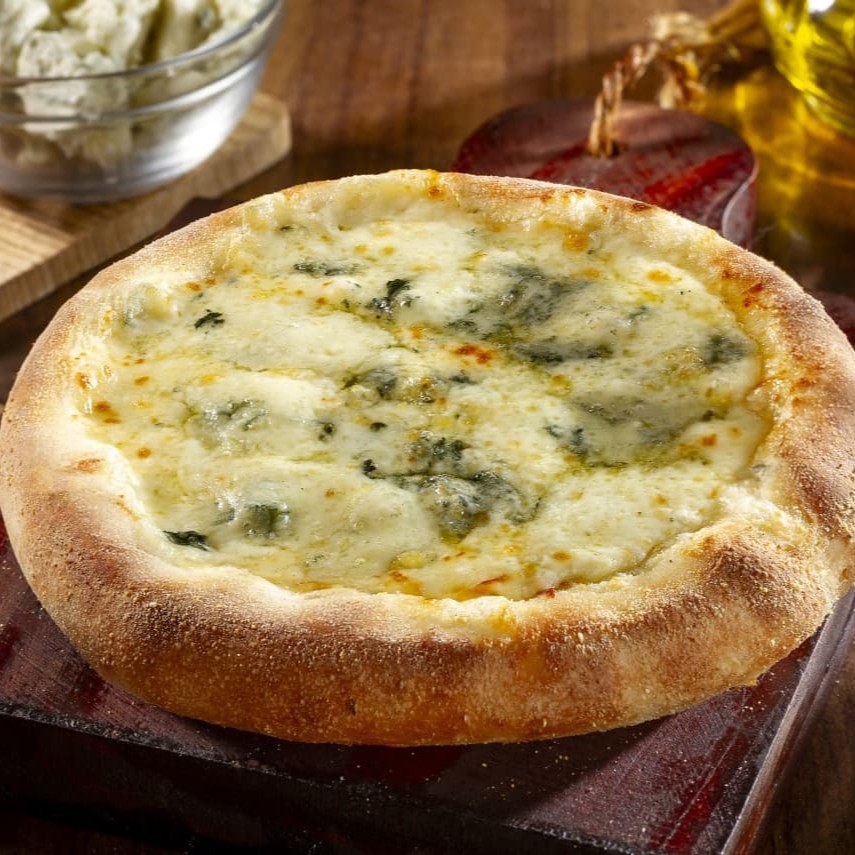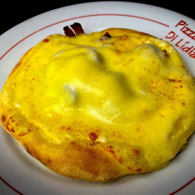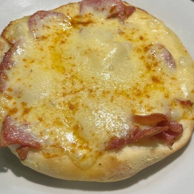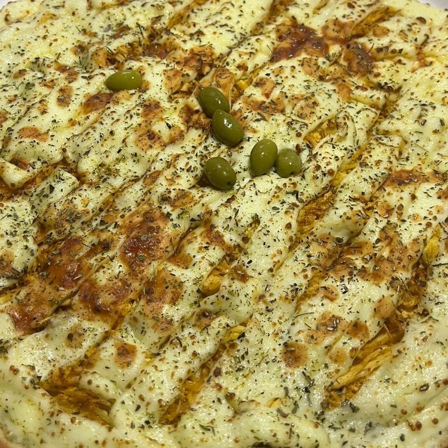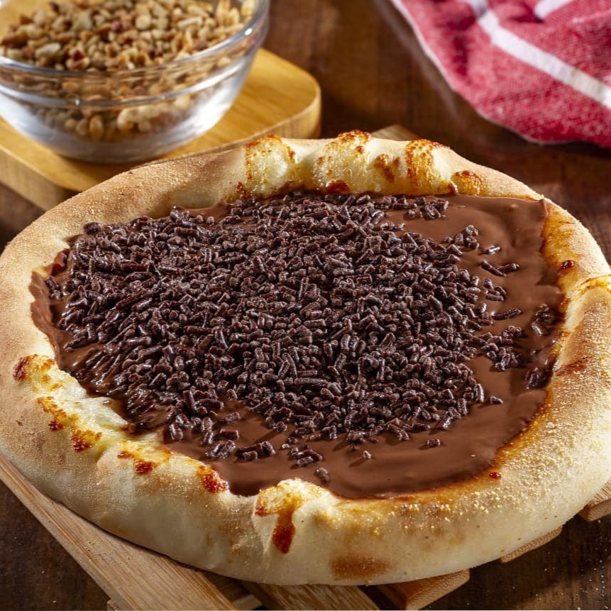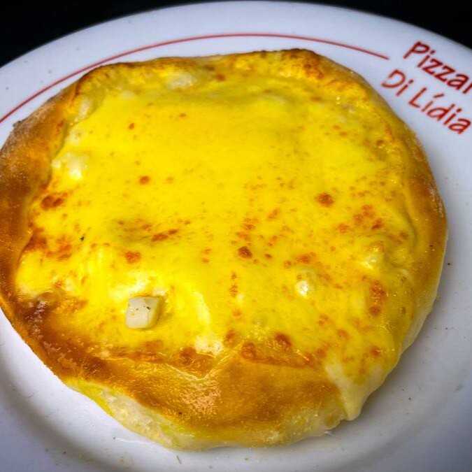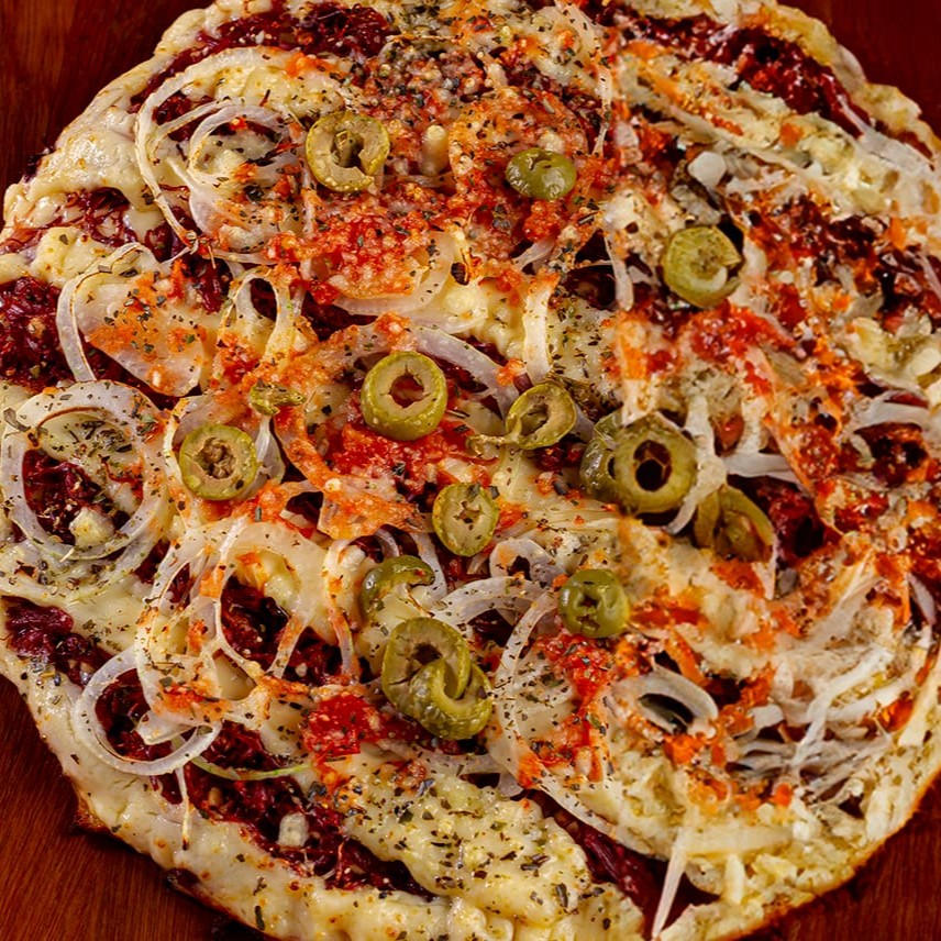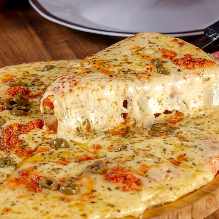 Muçarela, presunto, ervilha, palmito, calabresa, ovos e bacon.