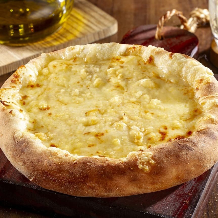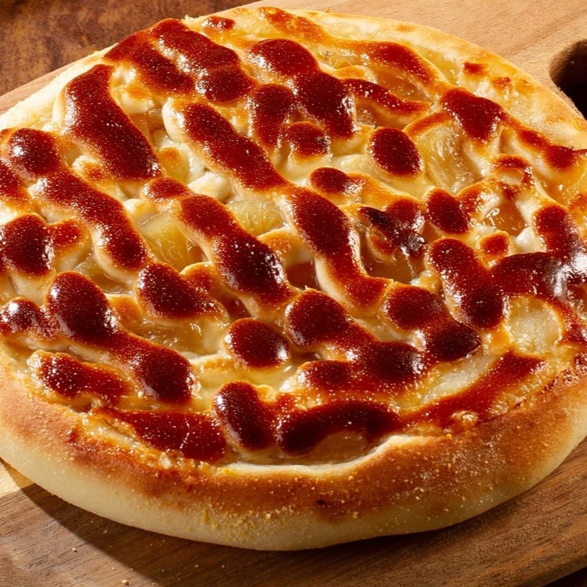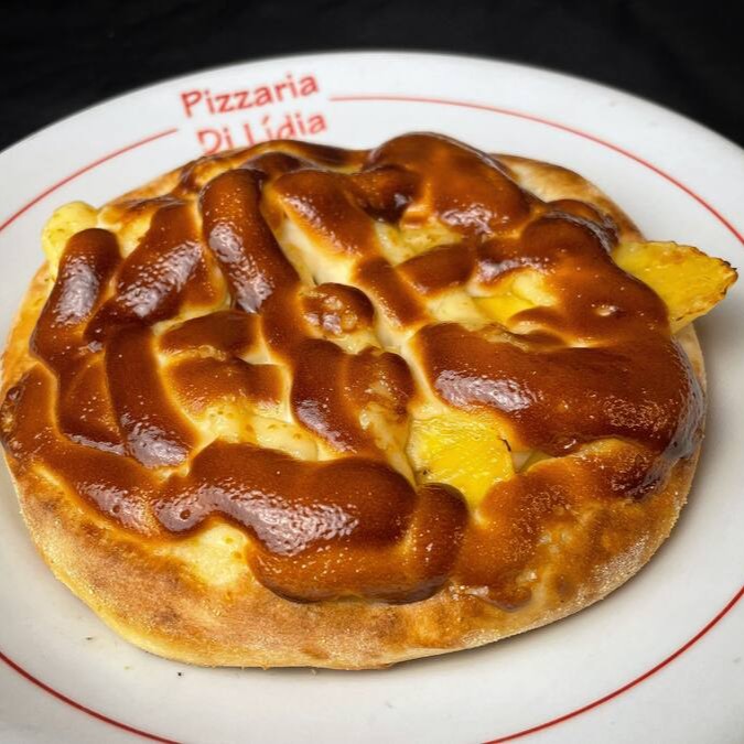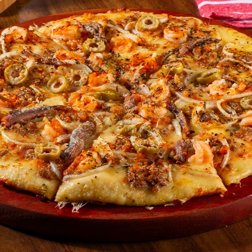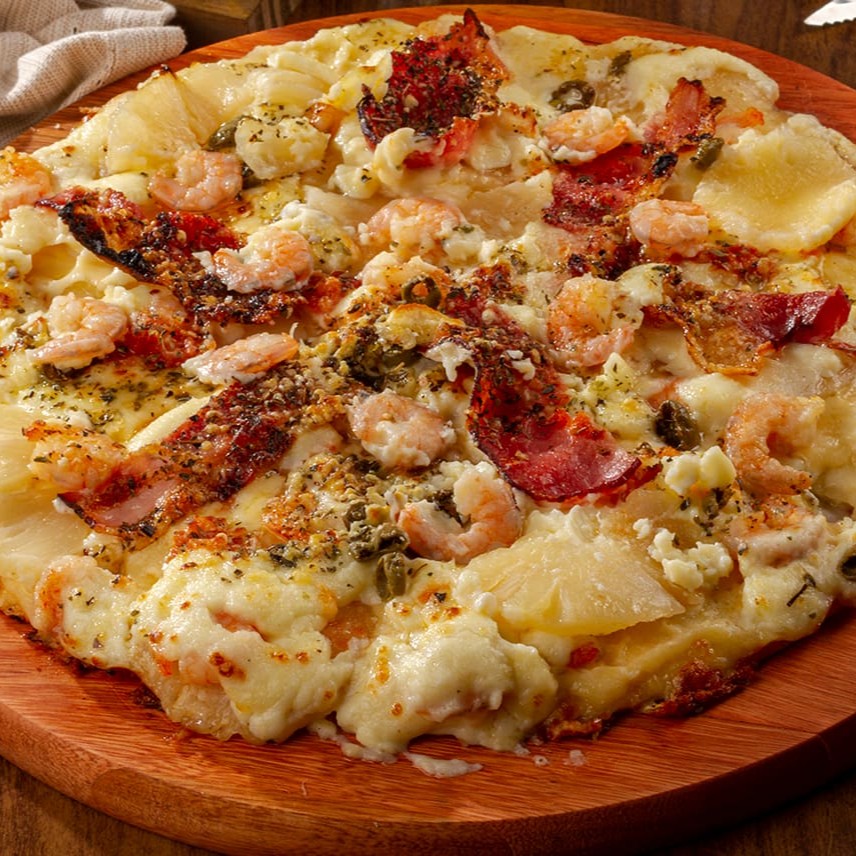 Camarão, mussarela, Catupiry, bacon e abacaxi.